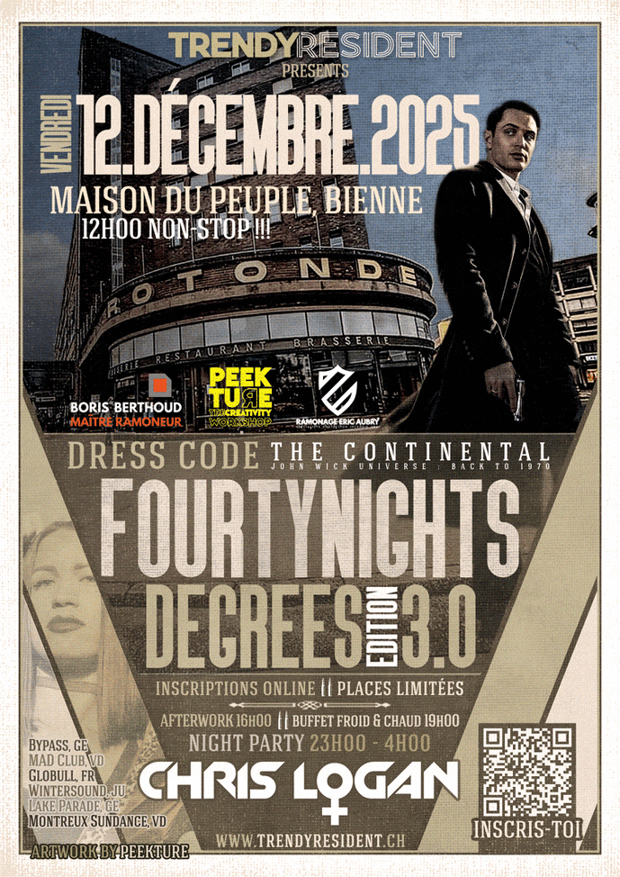 Vivez une soirée électrisante en compagnie de CHRIS LOGAN, DJ incontournable classée 11ᵉ en Suisse et 79ᵉ en Europe en 2018 (Djanetop.com). Habituée des plus grands clubs de Suisse romande et des festivals prestigieux tels que le Montreux Jazz, la Lake Parade et le Paléo, elle a rejoint en 2018 l'agence AProd aux côtés de DJ Snake et Martin Garrix. Nous aurons l'honneur de l'accueillir pour une nuit où ses sets électrisants et des surprises dignes de l'univers John Wick vous promettent une ambiance inoubliable !